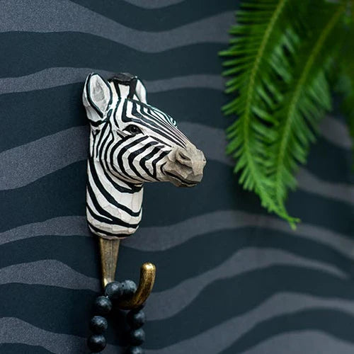 Denne realistiske sebraknaggen i sort og hvitt er håndskåret og håndmalt i tre, og gjengir sebraens karakteristiske uttrykk på en levende og detaljrik måte. Like vakker som praktisk – perfekt til å henge opp klær, morgenkåpe, vesker eller håndklær.