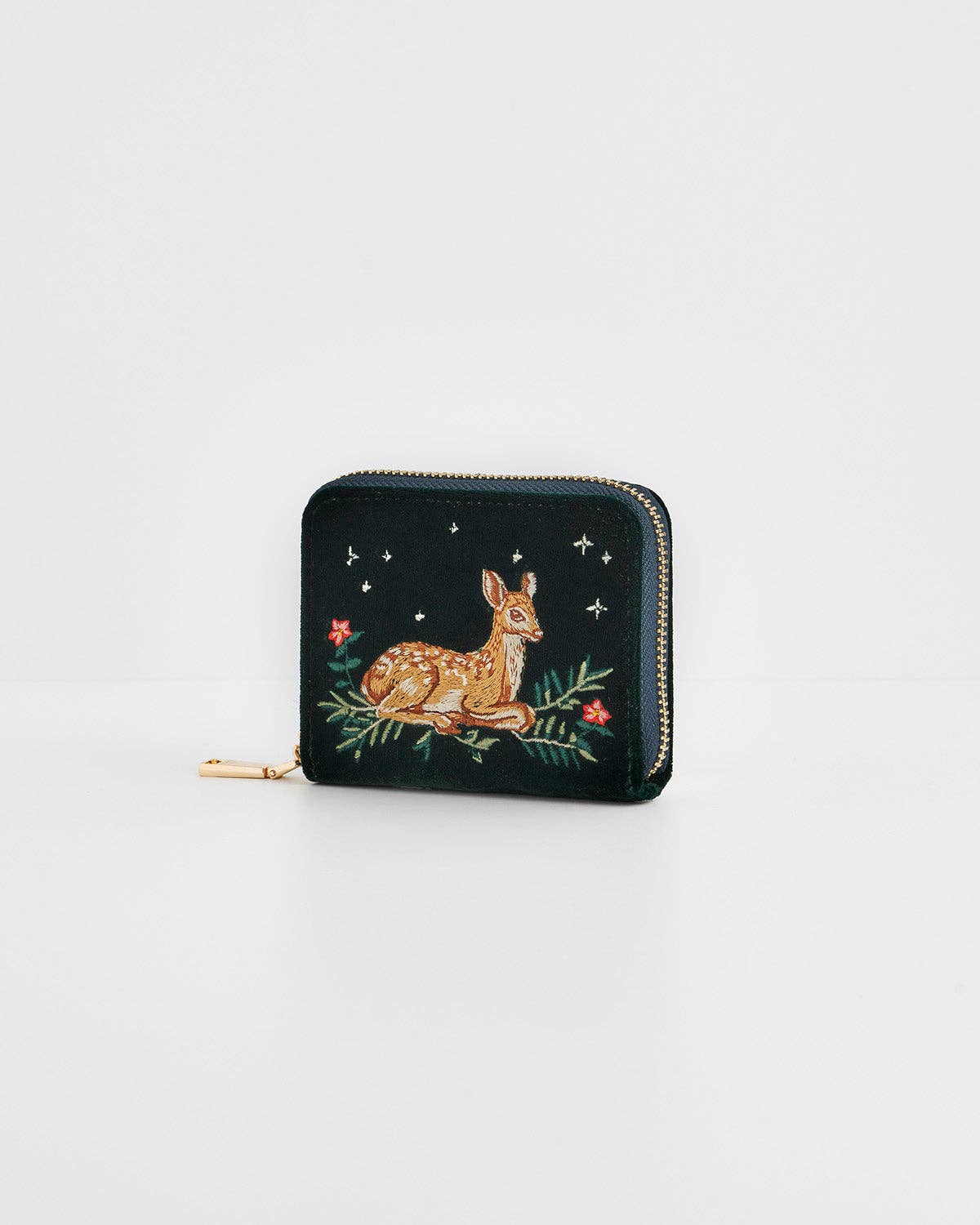 Med delikat broderi av en hvilende rådyrkalv, omgitt av friske bregner under glitrende stjerner, er pungen utført i en dyp grønn fargetone som symboliserer naturens ro og balanse.