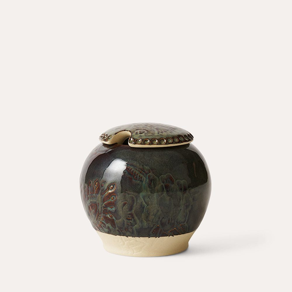 Den flytende glasuren gir en livlig overflate med naturlige fargeskiftninger, noe som gjør hver sukkerbolle helt unik. Glasuren harmonerer vakkert med mange ulike farger på bordet, og sammen med det karakteristiske mønsteret er dette et tydelig medlem av Sthåls Arabesque-serie.