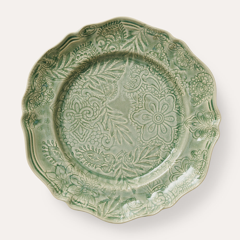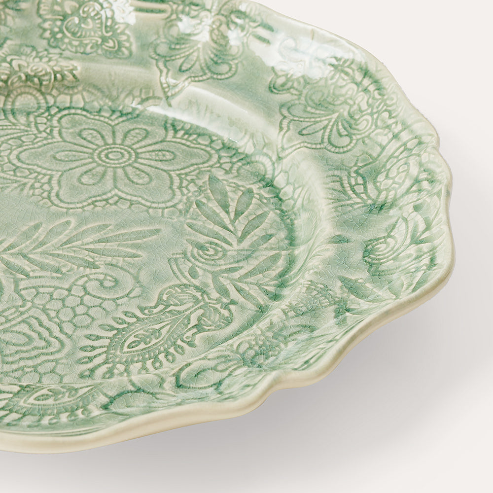 Velkommen til bords. Dette vakre runde serveringsfatet i fargen Antique er et blikkfang som alltid skaper stemning. Glasuren er kjærlighet ved første blikk – myk, varm og levende – og passer like godt til middagsretter som til desserter.