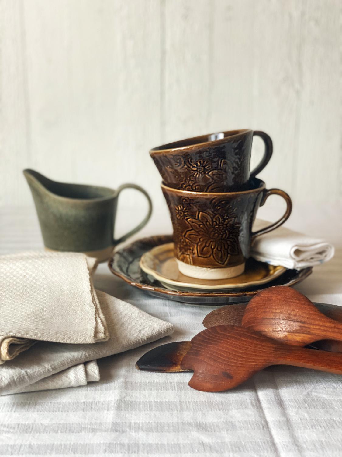 Den brune glasuren er en levende effektglasur med fine, subtile krakeleringer som gir dybde og karakter til overflaten. Glasuren flyter vakkert over formen og skaper naturlige fargeskiftninger, noe som gjør hver kopp unik.