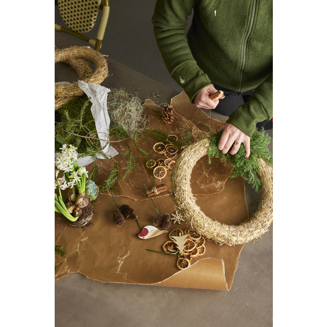 Størrelsen på 20 cm gjør den ideell til mindre dørkranser, borddekorasjoner, adventsarrangementer, blomsteroppsatser og sesongpynt. Halmoverflaten gir god festeevne for materialer som granbar, mose, tørkede blomster, bånd og dekorartikler.
