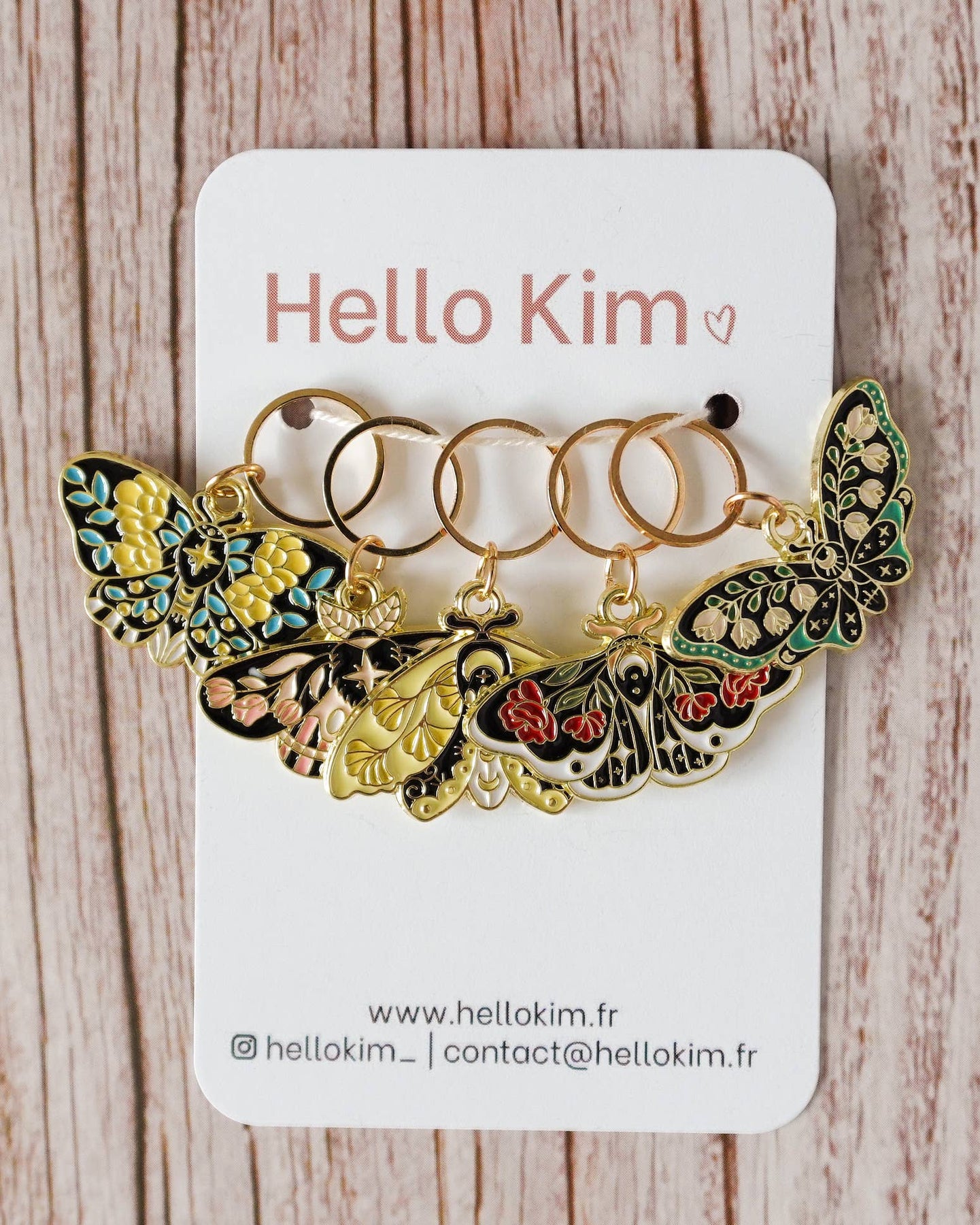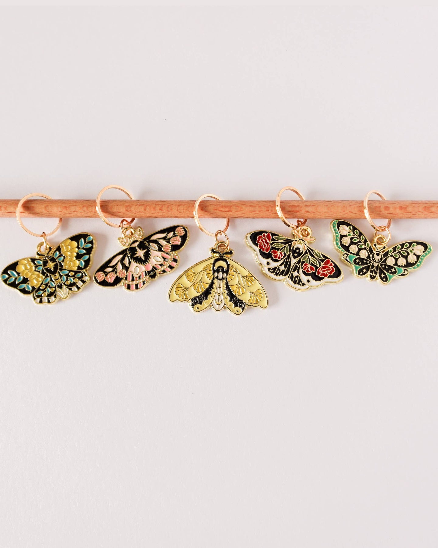 Et nydelig sett med 5 maskemarkører, perfekte små hjelpere som gjør strikkeprosjektene dine både enklere og vakrere. Butterfly-settet gir et lett og vårinspirert uttrykk, med sommerfugler dekorert med delikate blomsterdetaljer i vingene.