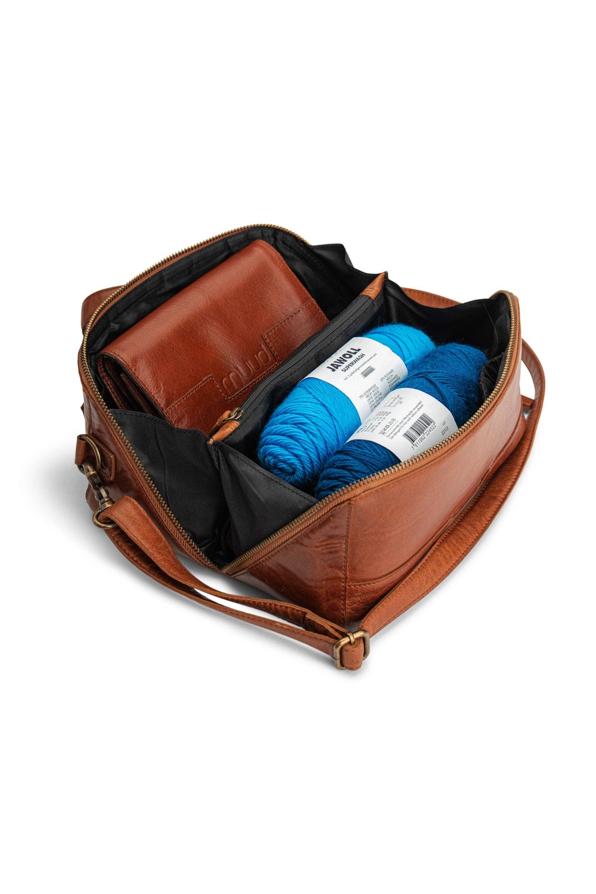 Innvendig finner du to romslige hovedrom som gir plass til både strikkeprosjekter og det du trenger i hverdagen. En lomme med glidelås sørger for trygg oppbevaring av småting.