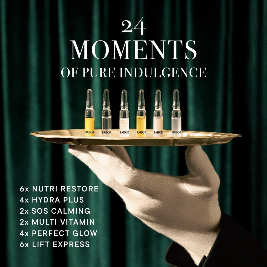 Gi huden din en luksuriøs opplevelse med BABORs eksklusive ampullekalender, designet for 24 dager med intensiv pleie, glød og velvære. Hver dag byr på et nytt øyeblikk av ren hudnytelse, pakket i elegante glassampuller som leverer høykonsentrerte aktive ingredienser direkte til huden.