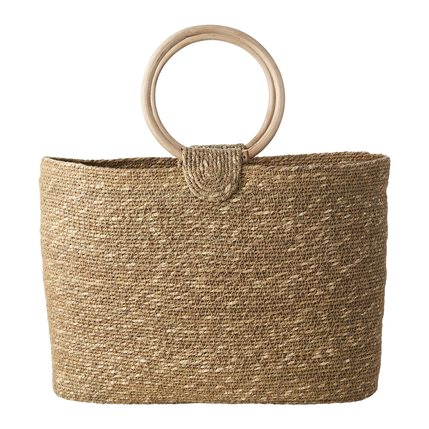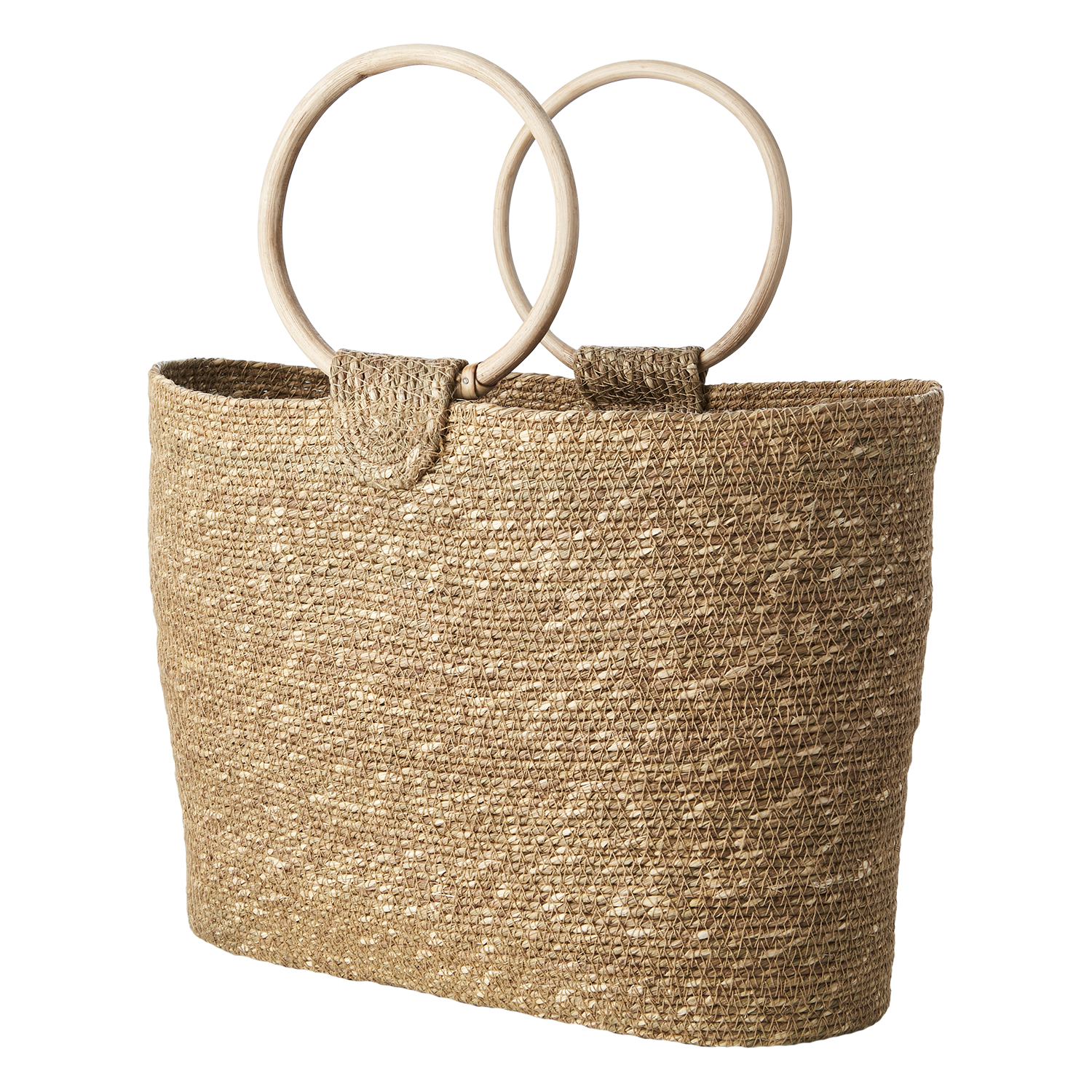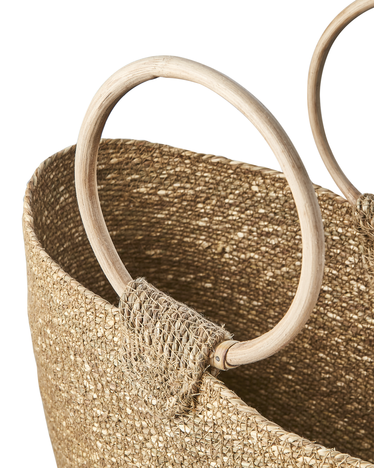 Denne vesken er en nydelig håndlaget tote i naturmaterialer, perfekt til hageklipp, markedsturer, oppbevaring eller som en dekorativ kurv i hjemmet. Den runde bambusringen gir vesken et unikt uttrykk og gjør den behagelig å bære. Den robuste fletten av sjøgress gir både struktur og varme til designet.